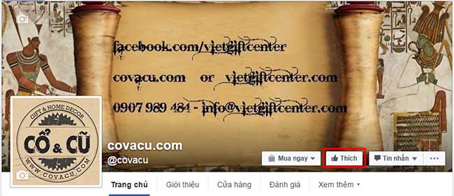 Bước 1: Vào fanpage của Cổ & Cũ: https://www.facebook.com/covacu hoặc https://www.facebook.com/covacu.gift nhấn nút Like (Thích)