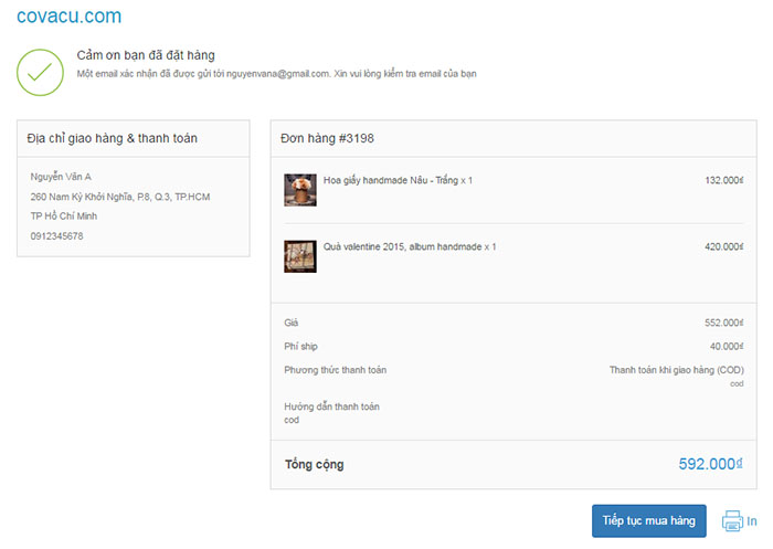 - Covacu.com gửi email và gọi lại trực tiếp để xác nhận đơn đặt hàng kèm thông báo phí vận chuyển, giảm giá (nếu có).