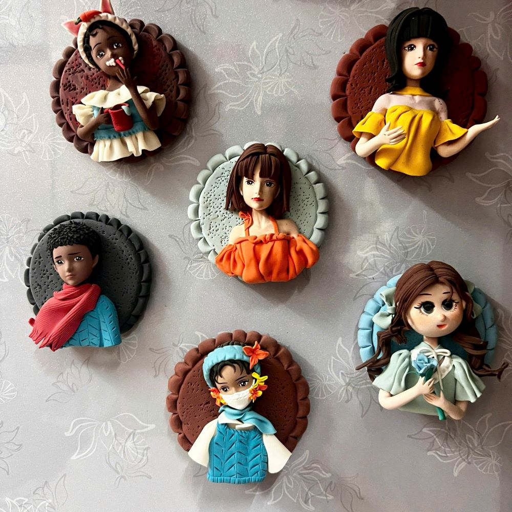 - Dùng trang trí tủ lạnh, bảng từ với phong cách riêng. Được tạo hình dựa trên hình ảnh cá nhân với các đặc điểm nhận diện qua màu tóc, mắt kính, dáng tay,...