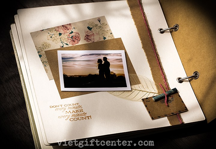 Sản phẩm được làm hoàn toàn thủ công và được trang trí bố cục sẵn, bạn chỉ cần thêm thắt các tấm hình của bản thân, thêm một số câu chữ chứa đựng cảm xúc là đã có một món quà không đụng hàng.