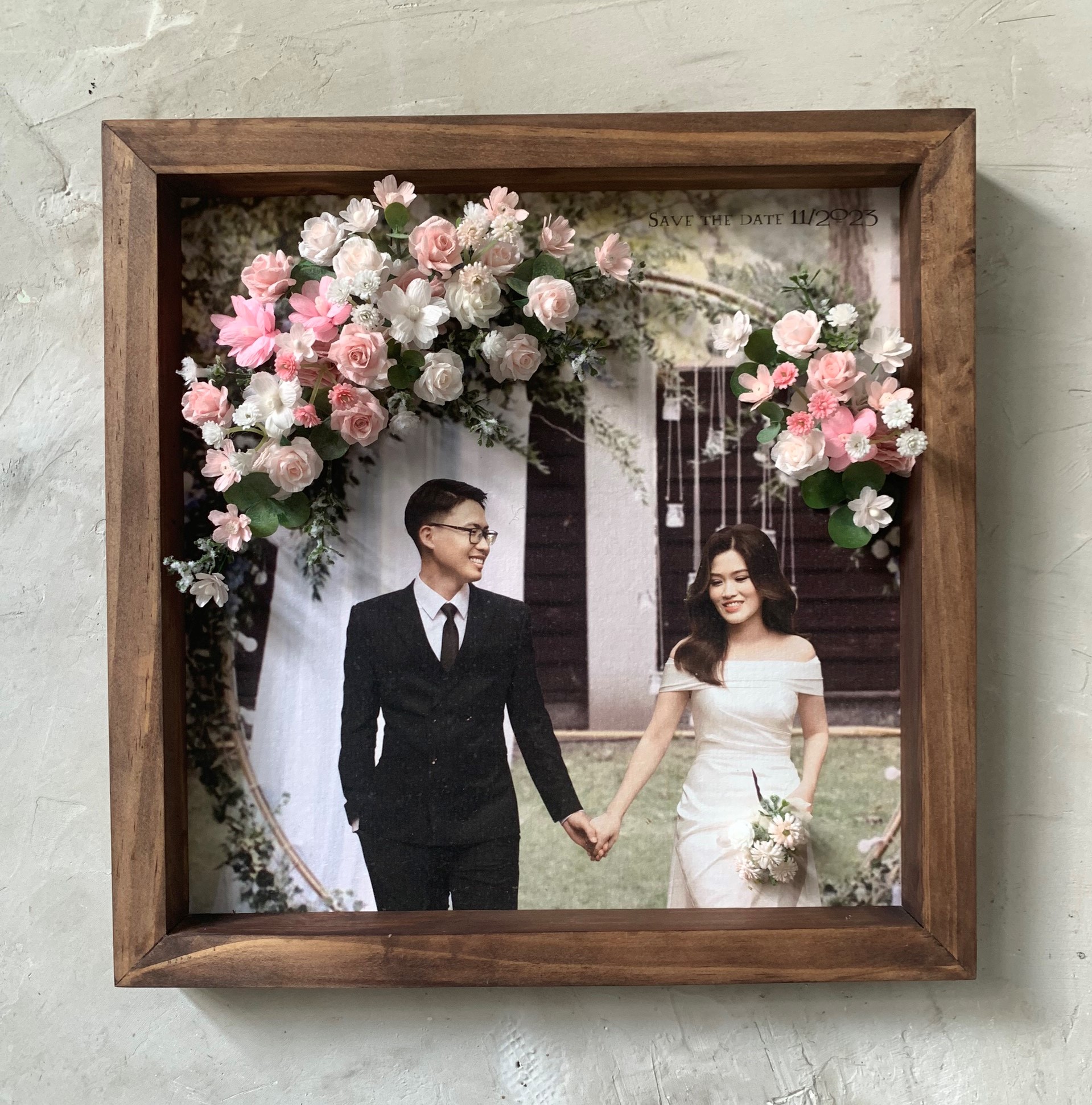 Tranh hoa giấy nhún handmade có hình vuông kích thước 34x34cm phù hợp với ảnh chân dung có thể để bàn hoặc treo tường, khung có độ dày 6cm nên có thể đứng vững trên bề mặt phẳng.